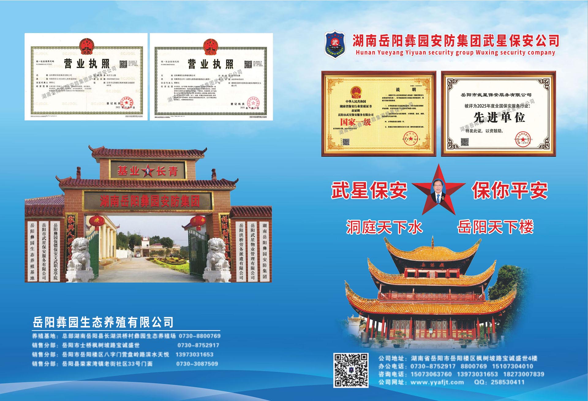 2017年6月正式成立了《岳陽(yáng)彝園安防集團(tuán)》,下設(shè)《武星保安公司》、《武星物業(yè)公司》、《洪橋勞務(wù)派遺公司》、《保鏢保安武術(shù)職業(yè)培訓(xùn)學(xué)?!返茸庸?/p>